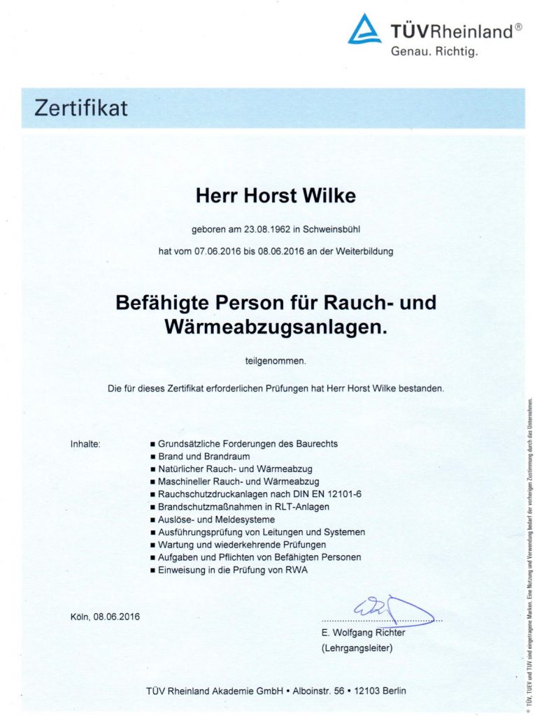 TÜV Zertifikat für Rauch- und Wärmeabzugsanlagen – RWA