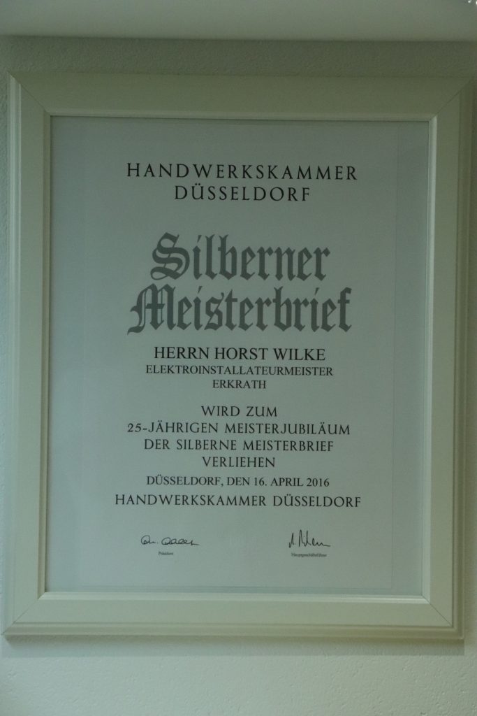 Silberner Meisterbrief als Elektroinstallateur für Horst Wilke in Erkrath und Düsseldorf und Umgebung